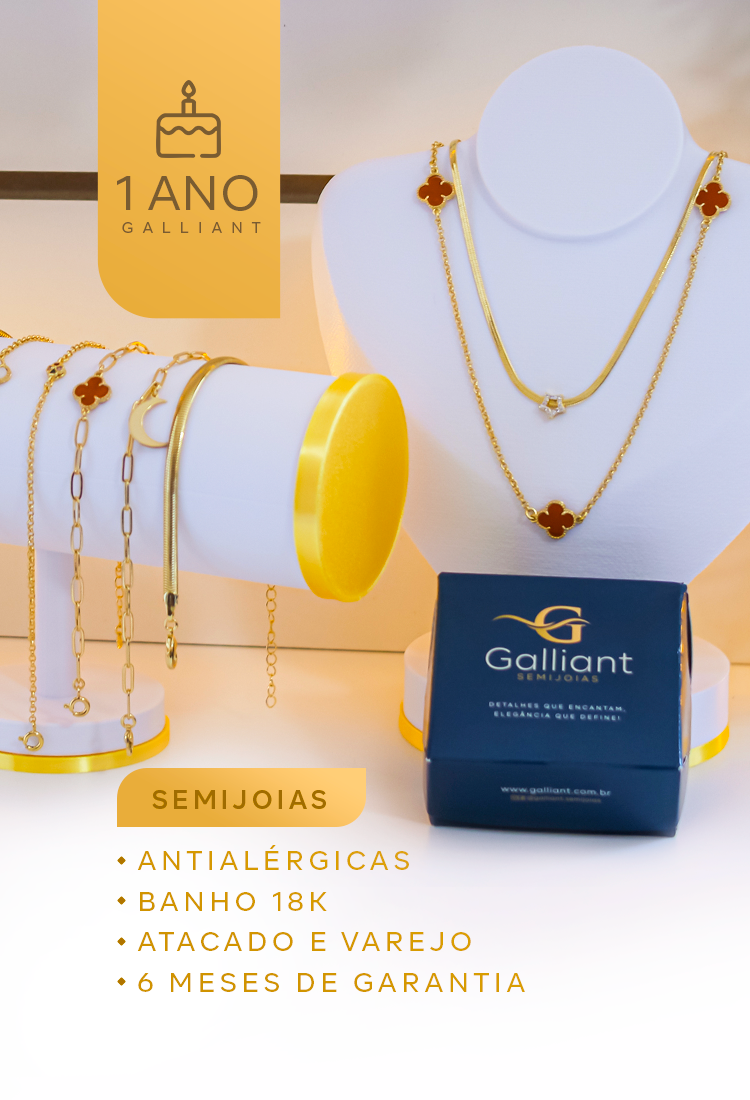 A Galliant oferece semijoias de alta qualidade e preço acessível, com um atendimento excepcional. Trabalhamos para trazer as tendências mais sofisticadas diretamente para o seu lar, garantindo uma experiência de compra online única e exclusiva. Nossa equipe está comprometida em oferecer peças elegantes e cuidadosamente selecionadas para realçar sua beleza.